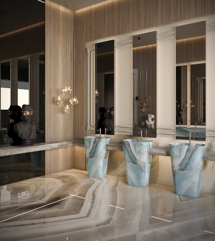 Washroom Design: The washrooms were crafted with a creative touch, featuring sleek glass elements and chic louvers with molded walls. A minimalist false ceiling enhances the clean, modern feel, offering a serene environment.