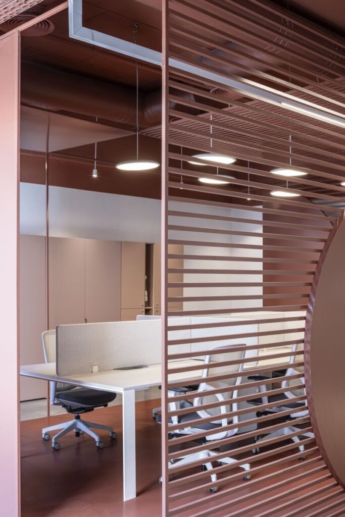 We embraced this vision with matte red walls featuring unfinished plaster textures, creating an edgy yet cohesive look throughout the office. The workstations were designed back-to-back, with white finishes, grey pinboards, and pedestals to ensure both privacy and collaboration.