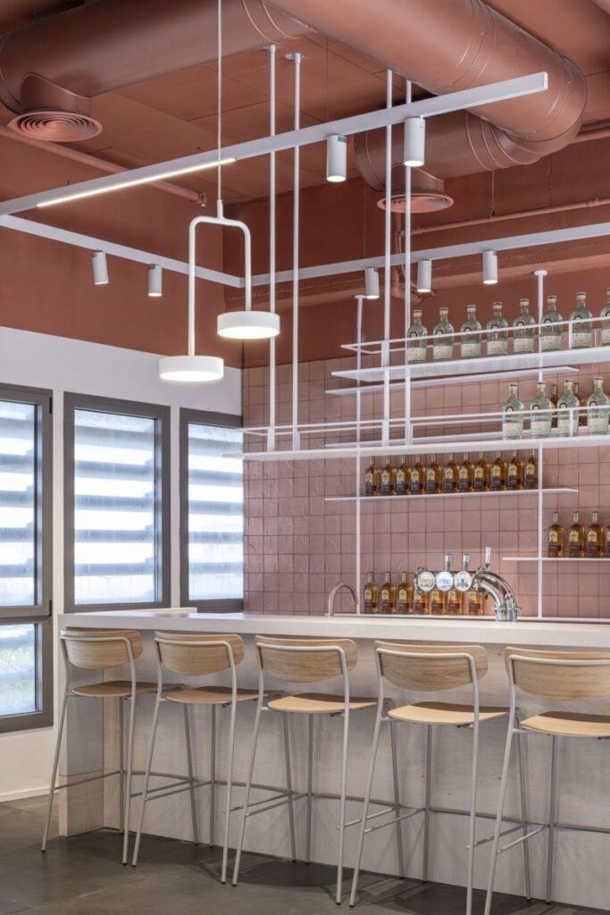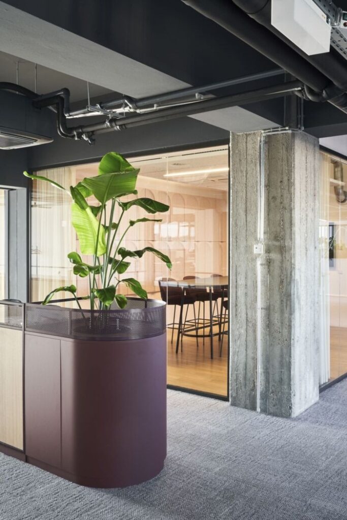 A special highlight of the office is the marketing zone, where a red-painted ceiling and creative metal design elements bring energy and creativity into the space. Mr. Johnson and his team were thrilled with the result—an office that was not only aesthetically striking but also functional, inspiring, and perfectly aligned with their vision.