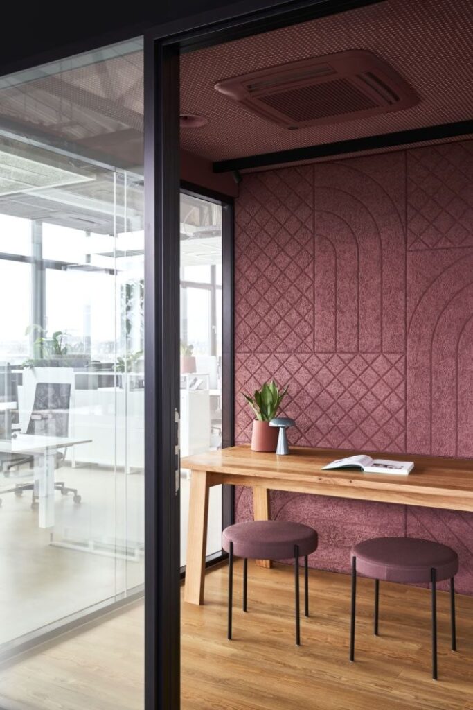 To add to the industrial vibe, we incorporated black ceilings with hanging linear lights, casting the perfect lighting on the grey carpet flooring beneath. The phonebooth cabin was designed with CNC-cut textured wall panels and melamine-polished hardwood furniture, complemented by full-glass partitions to keep the space open yet structured.