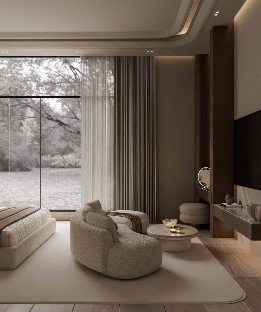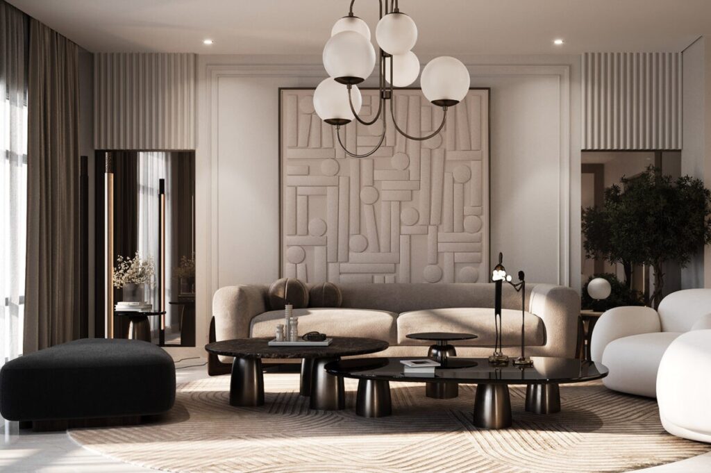 In the living space, curved modern sofas, luxe fabric paintings, and glass-fabric wall louvers come together to create an inviting yet opulent atmosphere.