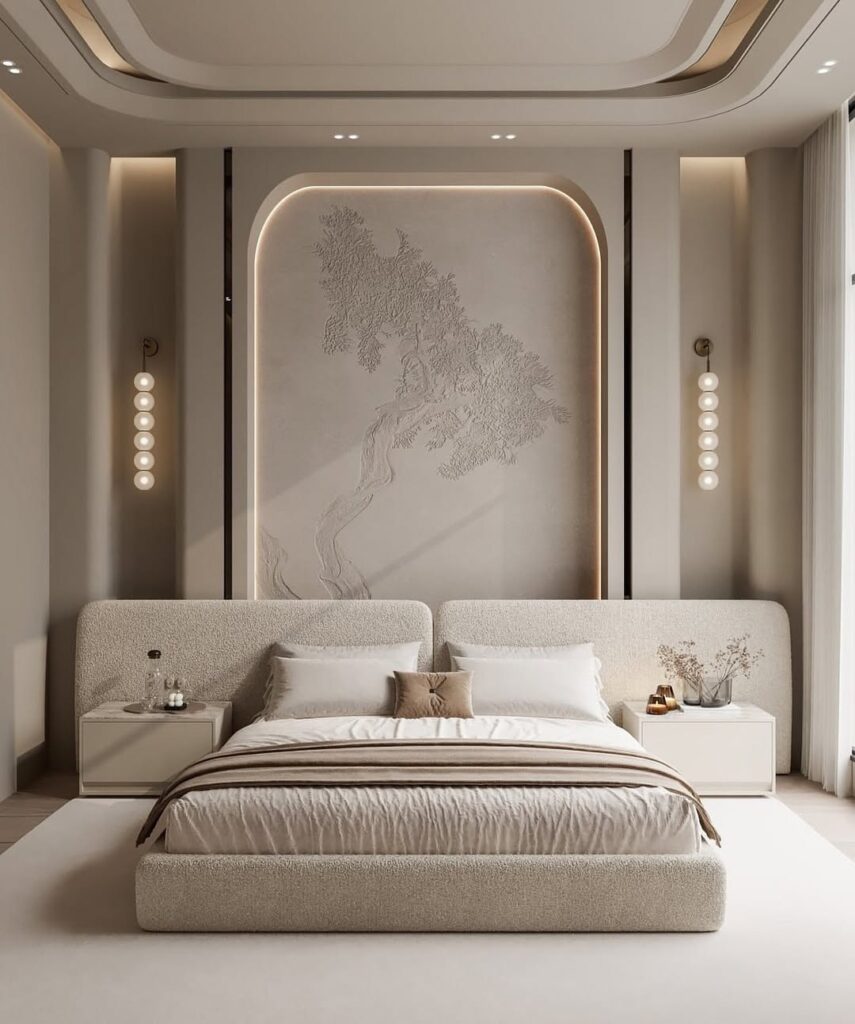 The master bedroom’s cream palette is accented by an illuminated CNC-carved wall design with soft curves. Wooden-texture flooring, a sophisticated bed, and glass-shutter wardrobes with profile lighting enhance the luxury quotient.