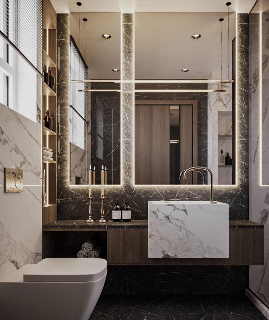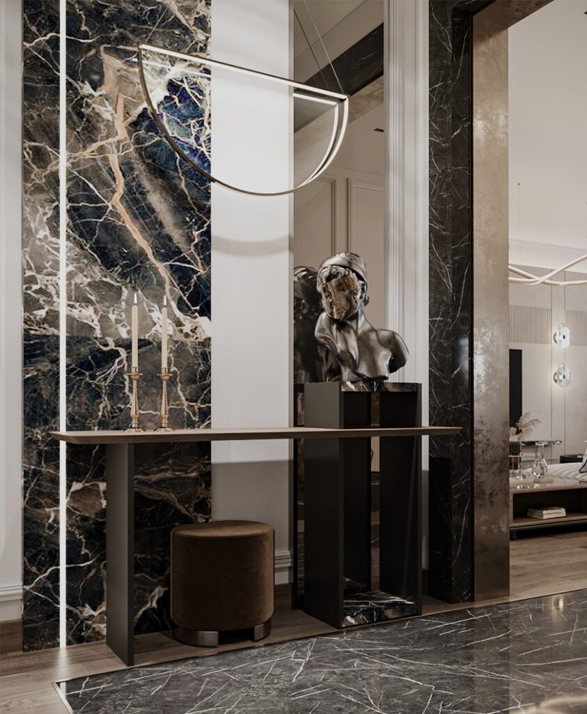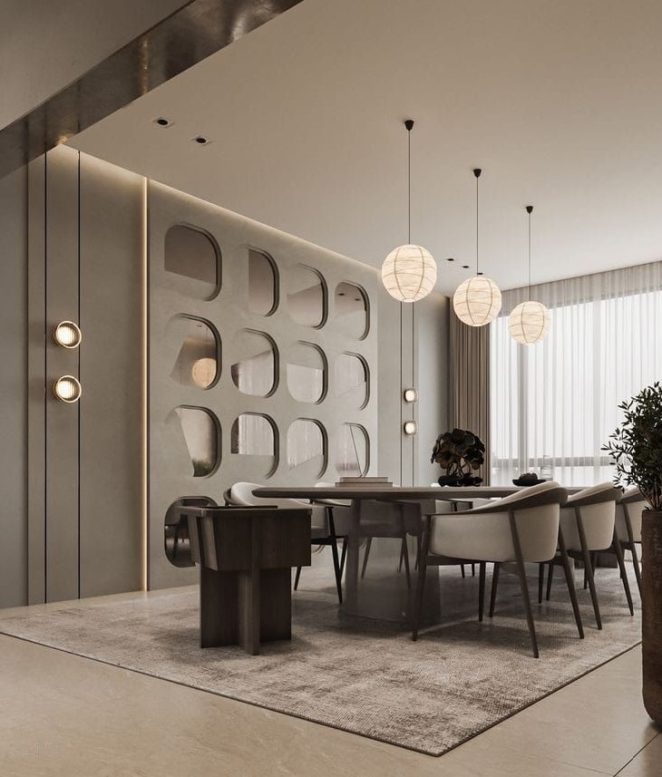 The dining area boasts an 8-seater marble-top table paired with modern quilted chairs. A striking CNC panel with organic mirror inlays and matte deco-finish walls sets a tone of refined elegance, complemented by contemporary wall sconces.