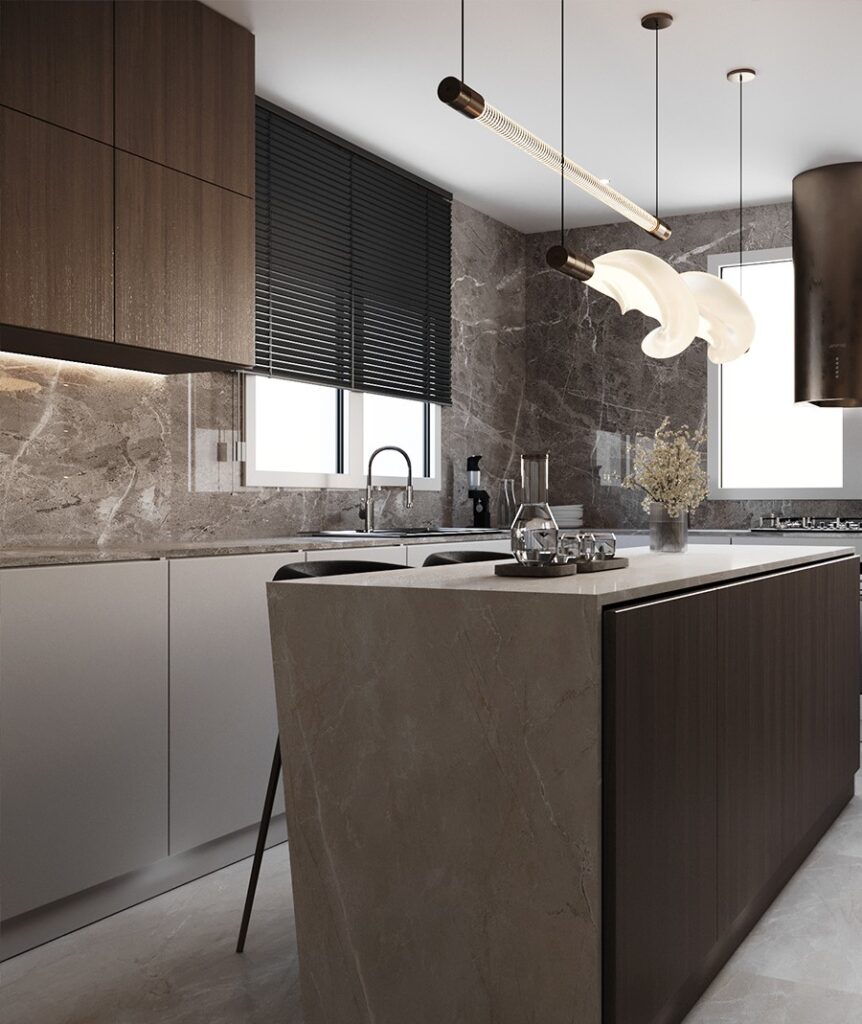 The kitchen, designed with an island layout in light grey and wood textures, combines sleek aesthetics with practical storage solutions—perfect for modern living.