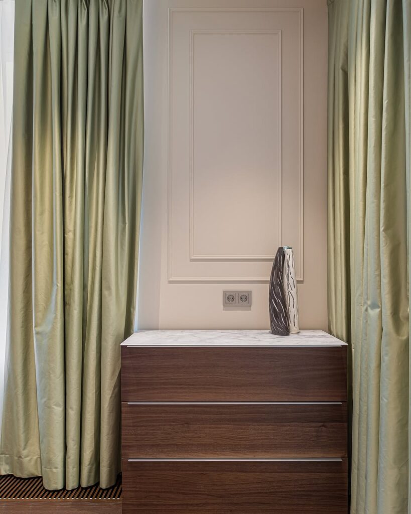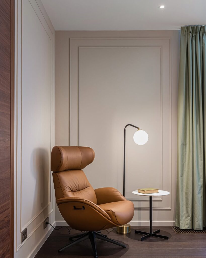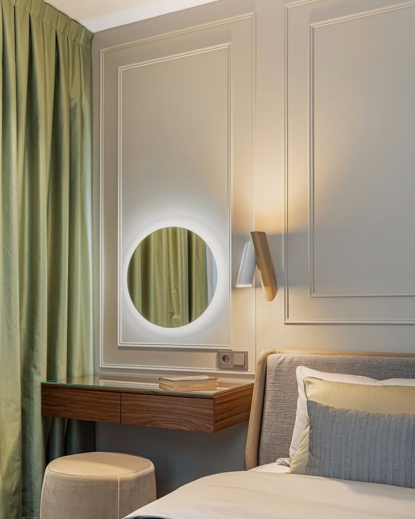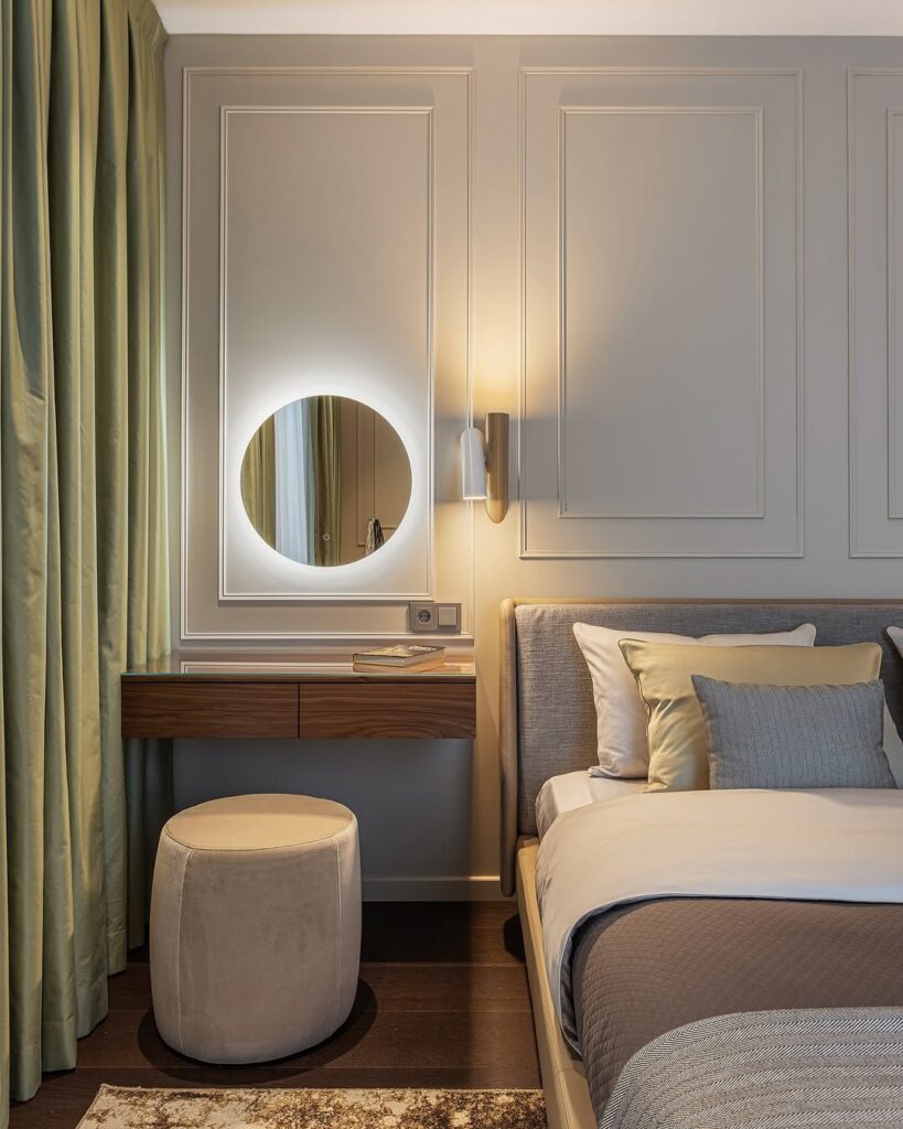The bedroom features a simple, yet modern, bed with a mini dressing table beside it, ensuring both style and functionality. The wall paneling with a unique molding design that adds an elegant touch to the compact space.