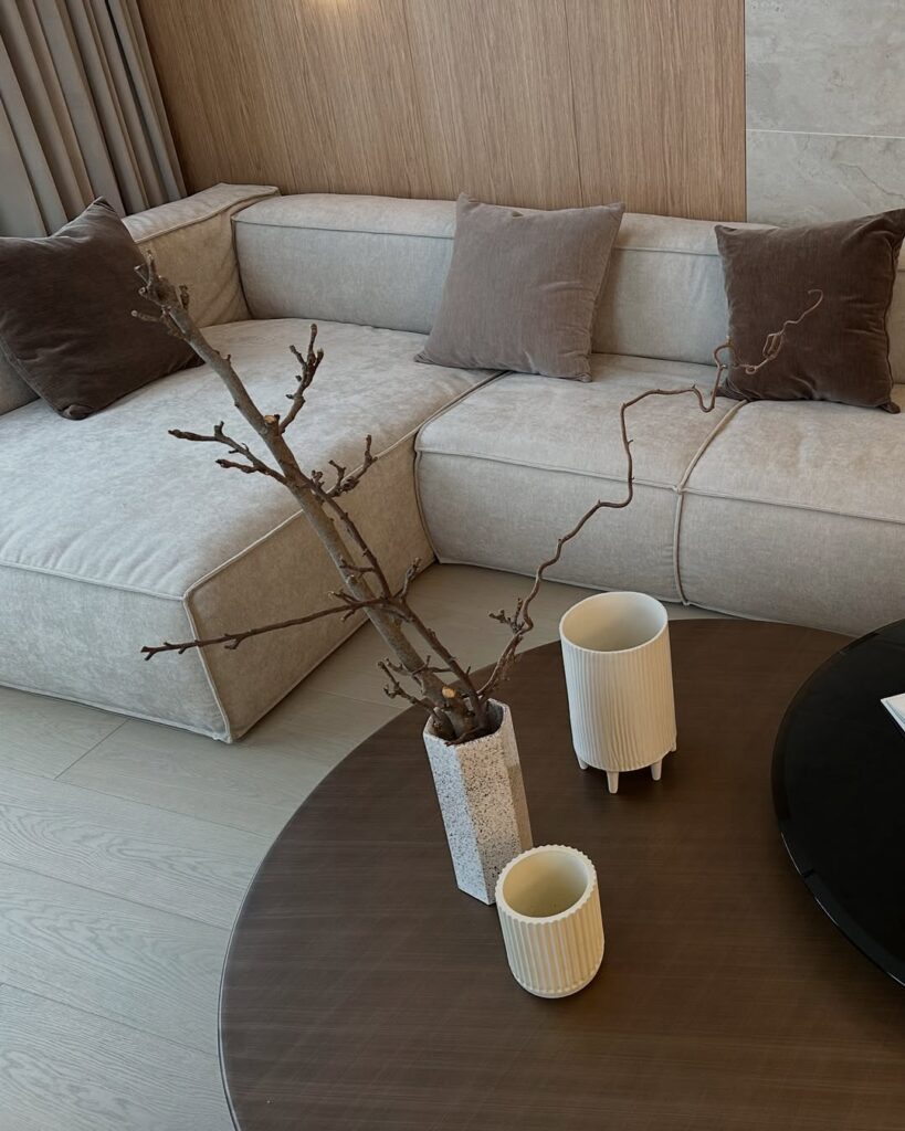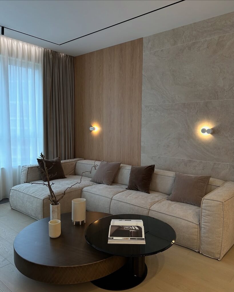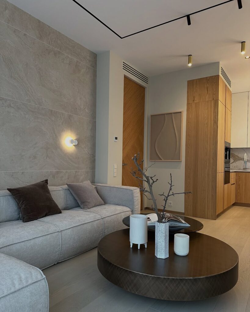 The living area was designed with a minimalist approach, with a 6-seater sofa making the most of the space. The Backside of sofa’s the wall is divided into two halves, with a textured paint finish on one side and wooden paneling on the other, providing a sophisticated and modern feel. The kitchen, with a mix of wooden laminate and sleek white upper cabinets, features a white Statuario-style quartz countertop for a touch of luxury.